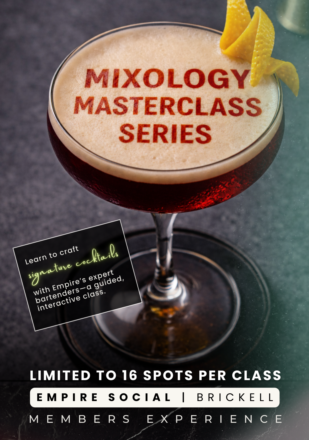 We’re excited to introduce the Empire Mixology Masterclass Series, launching Wednesday, February 11th at Empire Brickell—an intimate, hands-on program designed to transform how our members experience cocktails.